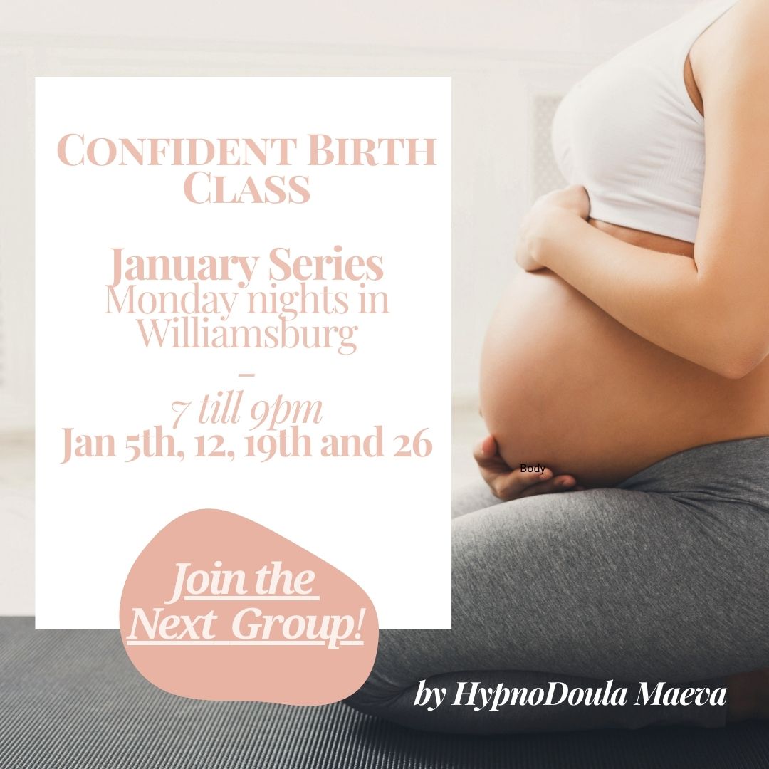 Start your journey with my Confident Birth Classes — designed to help you release fear, work with your body and practice the same mind–body tools I teach my private clients — all in a supportive group setting. These group and private sessions complement my doula care and are a wonderful way to begin your preparation journey.